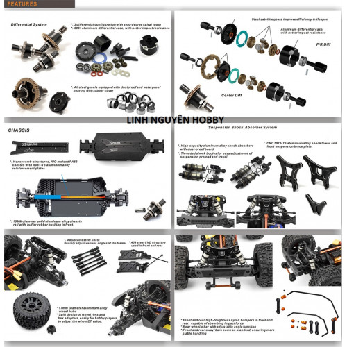 The "X-MARS MT" features a honeycomb-structured,  AIO molded nylon chassis, equipping with 6061 aluminum alloy reinforce plates. The whole vehicle uses steel gears paired with rubber-sealed, dustproof and waterproof bearings. Its transmission system incorporates front, middle, and rear differential units, equipped with sway bars in  front and rear. The frame supports multiple professional parameter adjustments, easily adapting to various terrains. Additionally, it's powered by a Hobbywing brushless system, compatible with 4-6S high-discharge li-po batteries for exceptional performance. Quick-release design for the motor mount, facilitating players to modify different gear ratios. The original factory comes standard with a remote control and a complete power system,  90% in RTR version (no battery and charger)